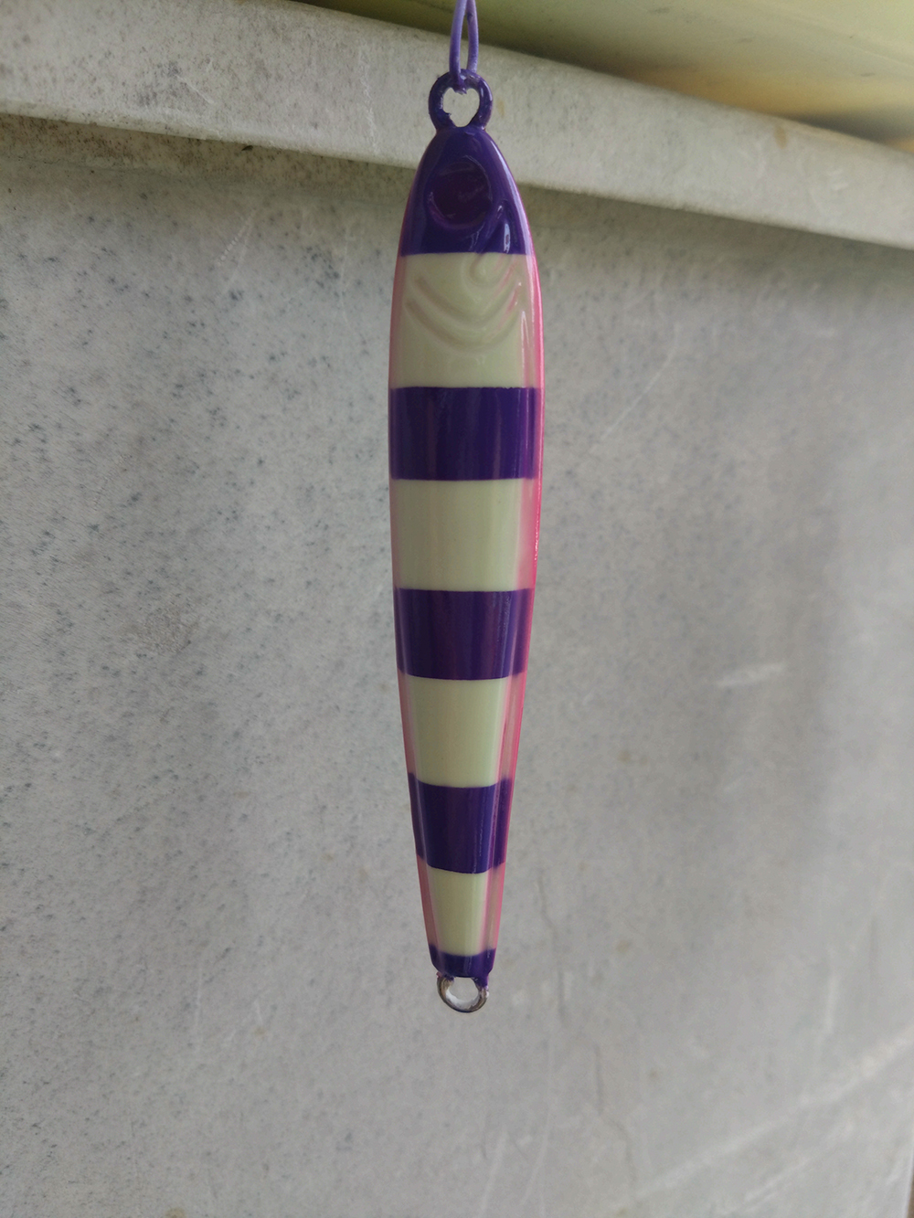 隣のエサ釣りで数本釣れたがジグに反応が無いのでTGベイトを塗り直したパープルグローに変更。